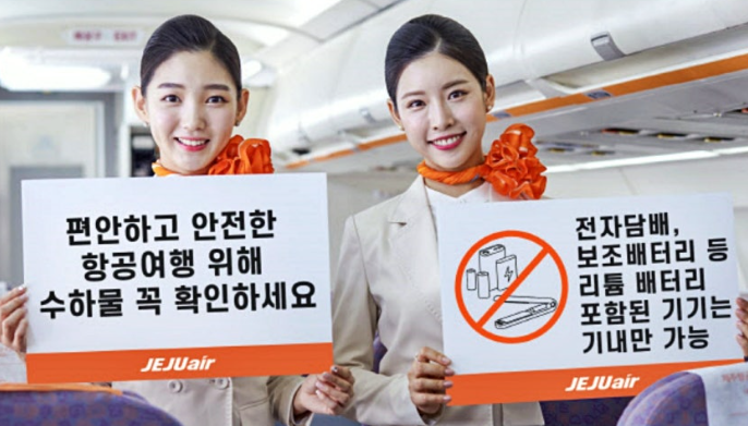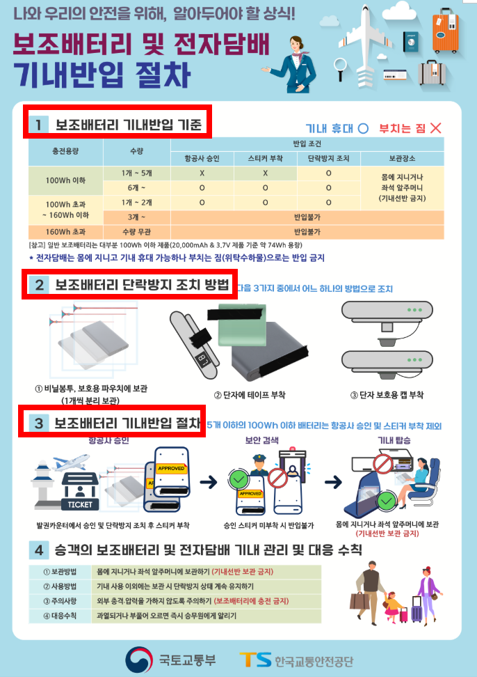 2025년 3월부터 항공사 승인을 받으면 대용량 3만밀리암페어시(mAh) 보조배터리는 2개까지만 기내 반입이 허용되도록 국토부에서 관리가이드를 시행했스빈다. 보조배터리는 선반에 보관하면 안 되고 휴대하거나 앞 좌석 주머니에 보관해야 한다. 기내전원을 이용한 보조배터리 충전도 금지됩니다.